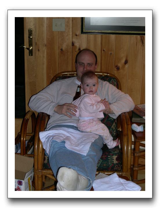 with Daddy in the Maine cabin -- M's hood doubles as a beer sling
