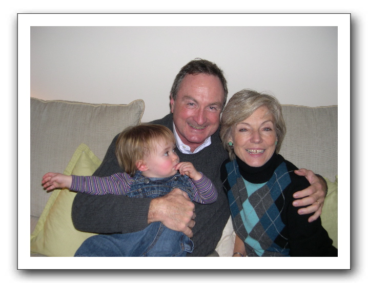M is decidely not looking at the camera; with Larry and Anne